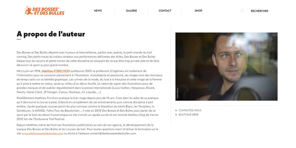 Le projet pour Des Bosses et des Bulles a nécessité une grande réflexion pour la refonte de leur site vitrine. L'objectif était de créer un environnement graphique épuré pour mettre en avant leurs illustrations humoristiques autour de l'univers du Trail Running. Pour cela, j'ai opté pour un design minimaliste, avec une navigation fluide et des animations légères pour donner du dynamisme au site.